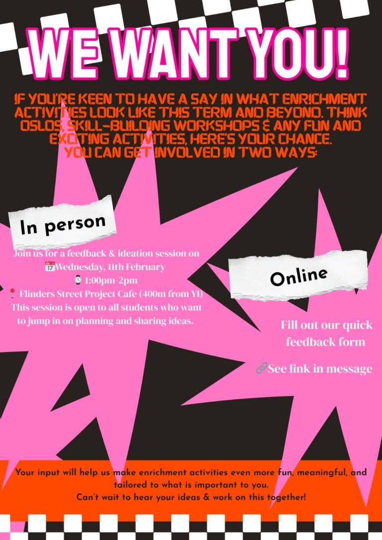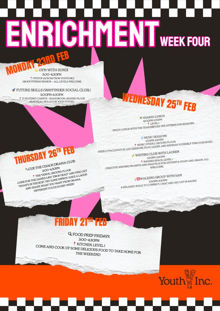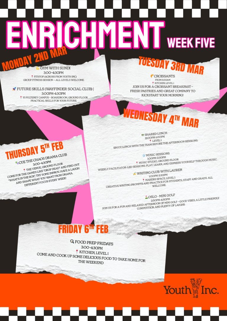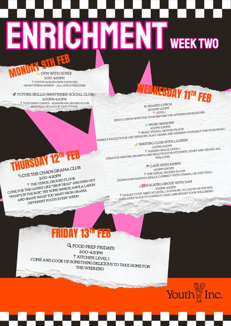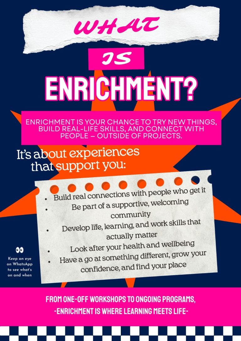 Enrichment is your chance to try new things, build real-life skills, and connect with people – outside of projects. From one-off workshops to ongoing programs, enrichment is where learning meets life.
